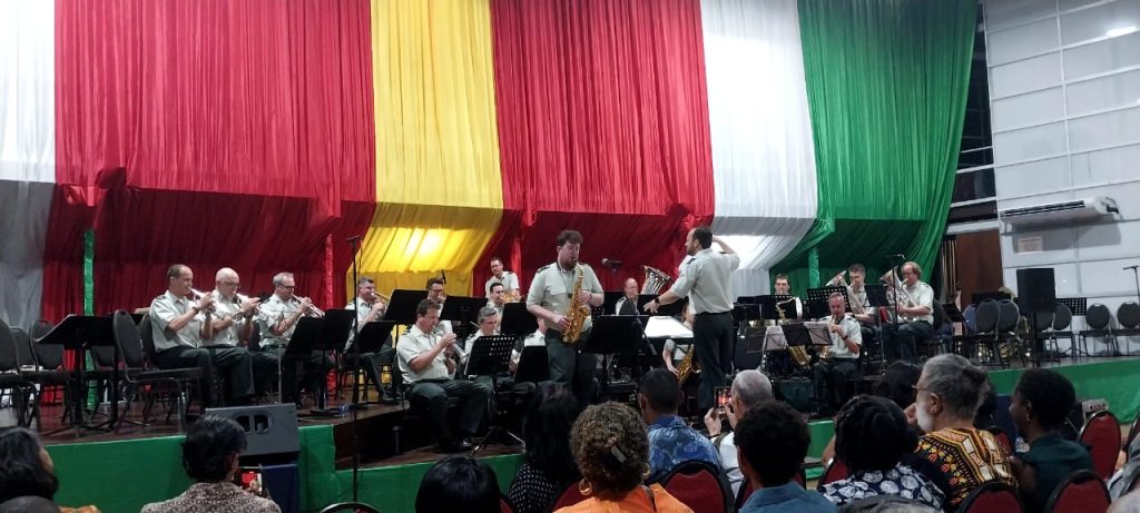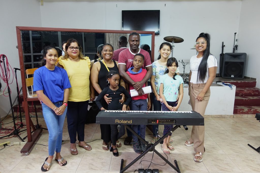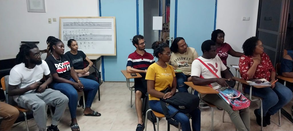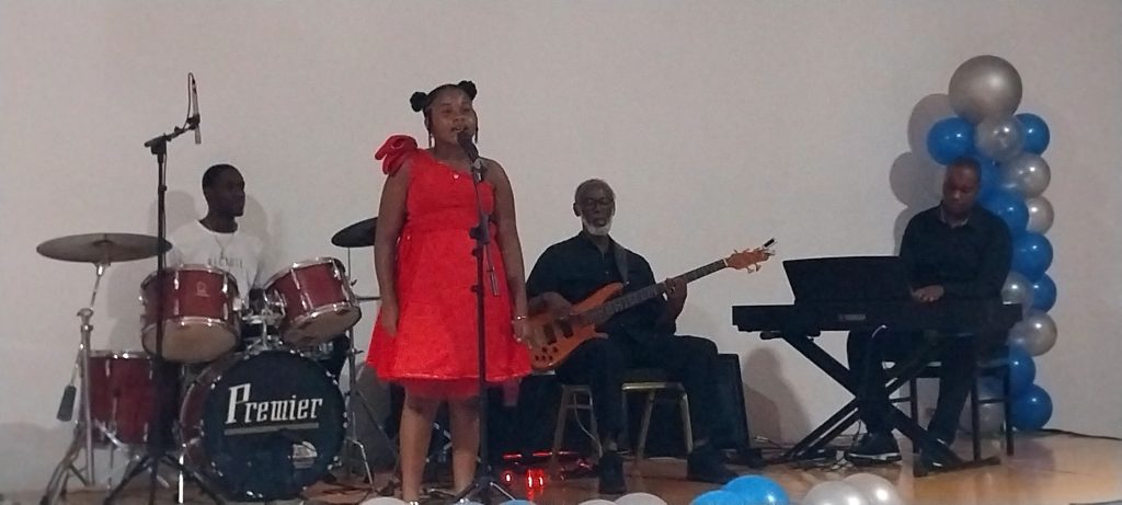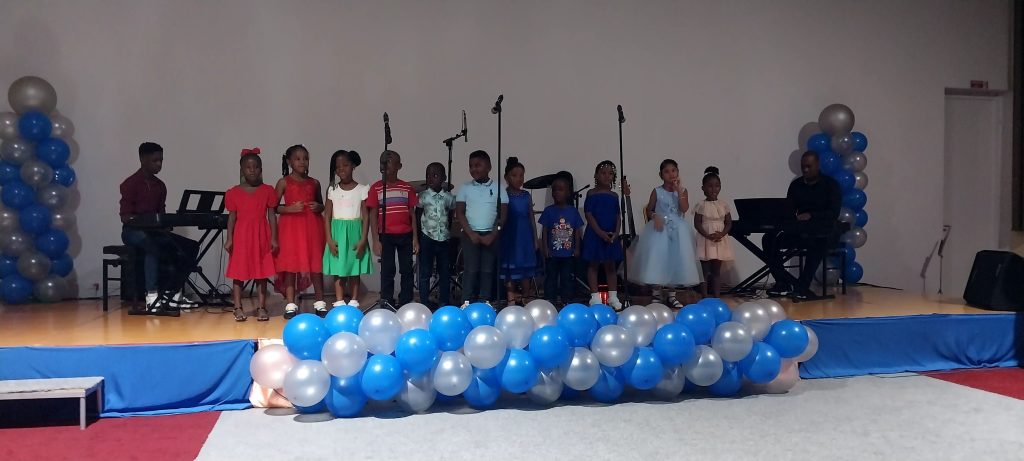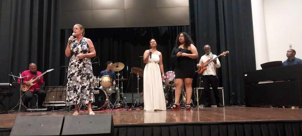 Groepsoptreden op een podium.